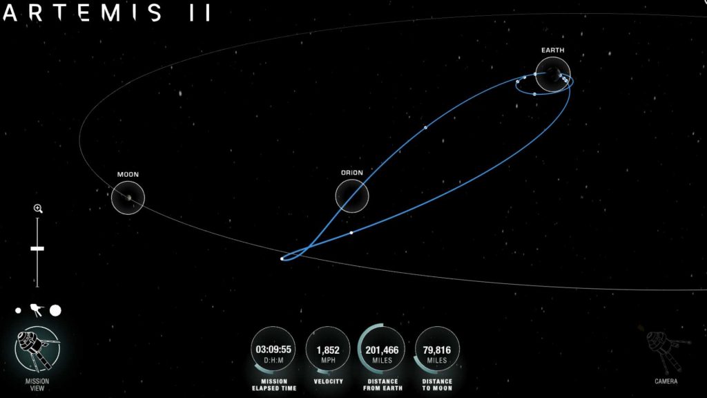 Podczas misji Artemis II statek Orion będzie można śledzić w czasie rzeczywistym dzięki narzędziu Artemis Real-time Orbit Website (AROW), które pokaże jego położenie względem Ziemi i Księżyca. W danych widocznych na ekranie pojawią się m.in. czas trwania misji, dystans od Ziemi, dystans od Księżyca oraz podstawowe parametry lotu, takie jak prędkość.