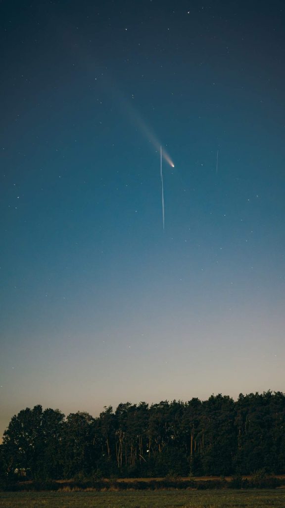 Ale widok! Starlinki przeleciały przez warkocz komety C/2023 A3 Tsuchinshan-ATLAS i były wyjątkowo jasne. Kolejna opcja do obserwacji kosmicznego pociągu już nadchodzącego wieczora. Zdjęcie na którym widać Starlinki w pobliżu komety otrzymaliśmy od Piotra. Są to satelity z grupy G9-7, która trafiła na orbitę przedwczoraj.
