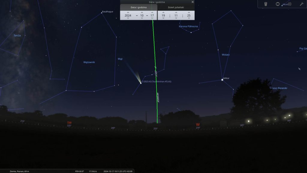 W czwartek 17 października Starlinki pojawią się na niebie nad Polską o godzinie 19:10. Podobnie jak wczoraj przelecą bardzo blisko komety, a w niektórych miejscach w kraju przetną jej warkocz. Na początku szukamy ich na niebie zachodnim nieopodal komety. Satelity Starlink skierują się na wschód i po około 4 minutach widocznego przelotu wejdą w cień Ziemi.