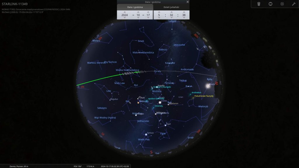 Jest jeszcze jeden wcześniejszy przelot, zdecydowanie wcześniejszy. Rano, 17 października o godzinie 5:32 Starlinki pojawią się nagle na środku nieba (wyjdą z cienia Ziemi) i przelecą w kierunku wschodnim. Są to satelity Starlink z serii G10-10 i jak się okazuje też są bardzo dobrze widoczne.