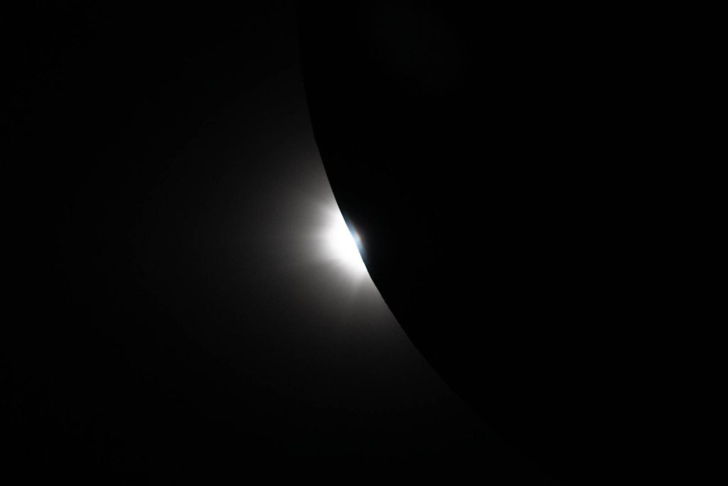 - Planeta Wenus w kadrze: Na lewej krawędzi zdjęcia widoczny jest jasny, srebrzysty punkt. To Wenus, która dzięki niemal godzinnej ciemności wywołanej zaćmieniem, stała się doskonale widoczna obok korony słonecznej.